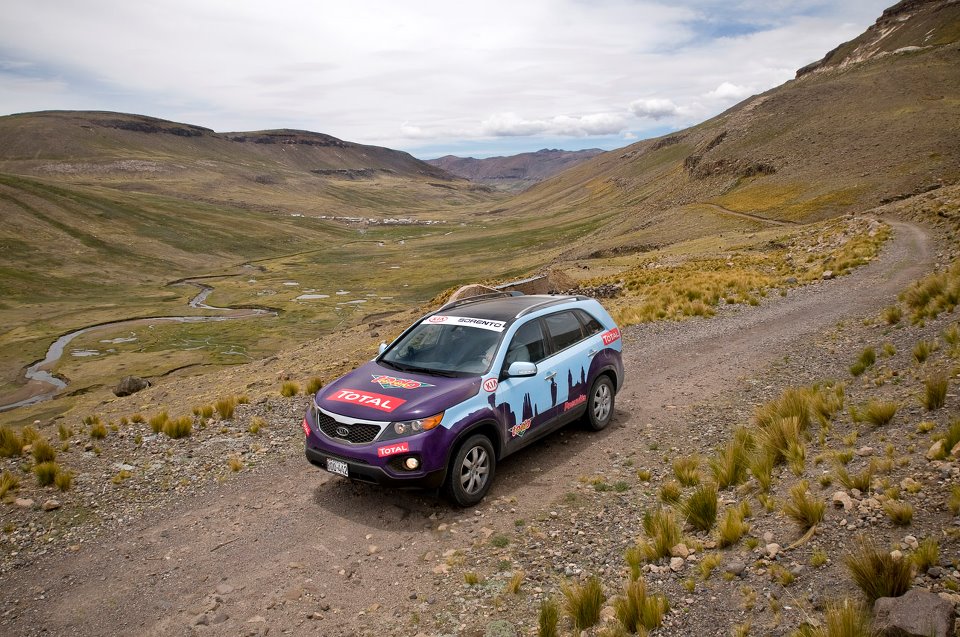 Em três etapas, o Kia Sorento 4WD ainda não se cansou de andar: faltam 13 km para cumprirmos os primeiros 1500 km rodados através do Peru. Esta terceira etapa, integralmente decorrida nos Andes, desde Puquio até Ollantaytamba, no Vale Sagrado dos Incas, foi praticamente idêntica às anteriores em termos de distância, mas absolutamente diferente do ponto de vista de percursos e de experiências, cada vez mais fortes. Foram pouco mais de 13 horas a subir e a descer, com diversas passagens acima dos 4000 metros de altitude (duas superaram mesmo esta marca, aproximando-se dos 4600 m.a.), para depois batermos no fundo de vales que chegaram a levar-nos abaixo dos 1800 m.a.. Encontrámos neve nalguns picos e fomos até surpreendidos com um pequeno troço ainda cheio de neve, que talvez não tenha durado muito mais tempo, pois naquele momento chovia torrencialmente e a neve começa a diluir-se. As únicas rectas dignas desse nome foram as que encontramos num planalto entre os 4500 e 4600 metros de altitude, onde o Sorento foi “espremido” ao máximo para alcançar 139 km/h., uma velocidade vertiginosa se atendermos a que nestas alturas os motores não respiram e perdem até metade do seu rendimento. O mesmo sucede com as pessoas e este é o lado violento desta viagem, pois para quem vive normalmente ao nível do mar, estas subidas quase que instantâneas a altitudes tão elevadas custam a suportar. Mesmo assim, neste dia sentimos-nos bem melhor. Ainda bem!…